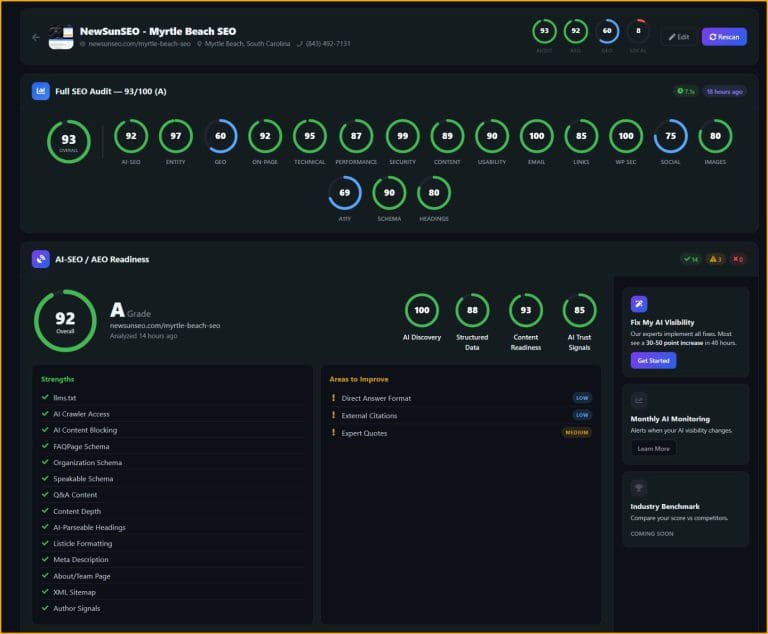 Follow our priority recommendations or let us handle the fixes. Watch your score climb and AI start recommending you.
